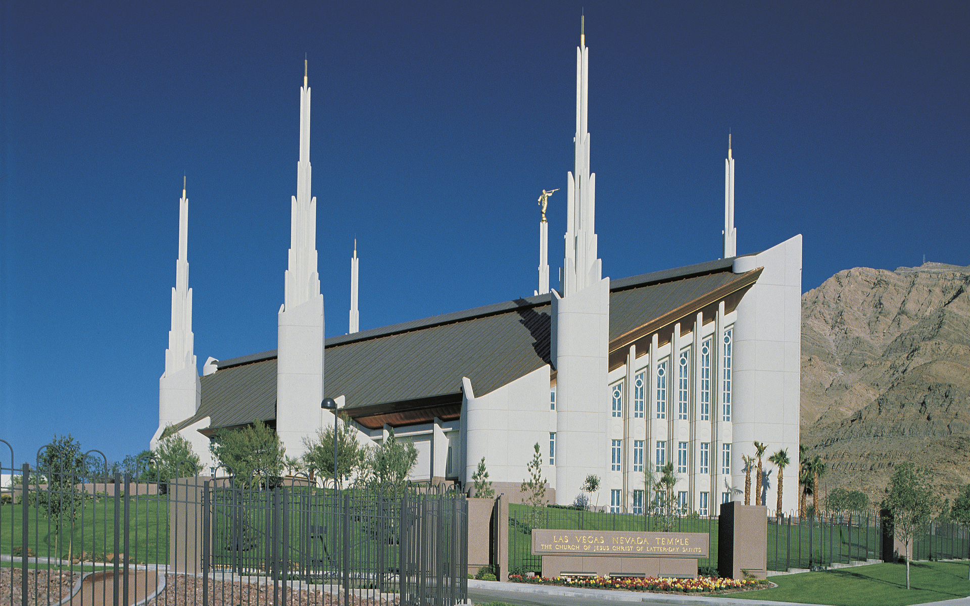 The Las Vegas Nevada Temple, 43rd operating temple of The Church of Jesus Christ of Latter-day Saints, is located the eastern edge of the city—far from the glitz and glamour of the world-famous Las Vegas Strip. Here it stands as a spiritual beacon in the City of Lights. The six soaring spires rising from the building echo the arresting red desert peaks of nearby Sunrise Mountain. Flourishing flowers and trees adorn the verdant grounds of the temple. Visitors are welcome to walk the surrounding pathways to feel the peace that eminates from this sacred structure.